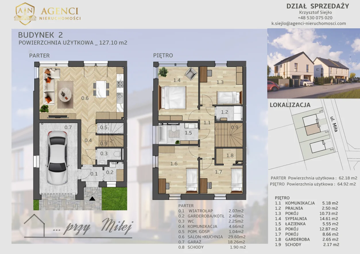 Na parterze znajduje się przestronny salon z aneksem kuchennym, tworzący jasne i otwarte serce domu z wyjściem do ogrodu. Obok zaplanowano praktyczne pomieszczenia użytkowe, w tym kotłownię i garaż z bezpośrednim wejściem do środka. Piętro to strefa prywatna – trzy sypialnie, wygodna łazienka, garderoba oraz pralnia zapewniają porządek i wygodę każdego dnia.